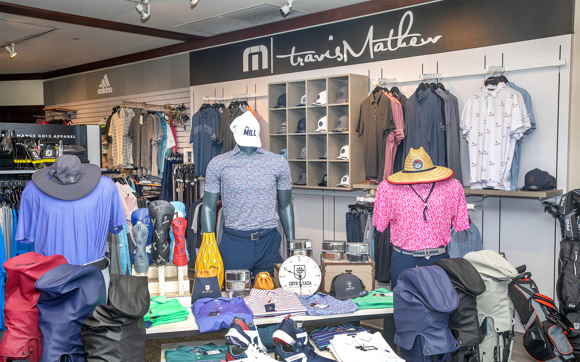 Coto de Caza: Your ultimate destination for golf equipment, apparel, and accessories. Featuring a wide variety of top brands like Titleist, Callaway, TaylorMade, PING, G/FORE, Peter Millar, Adidas, Blaydon's Key, FootJoy, Johnnie-O, Head, Straight Down, Levelwear, Travis Mathew, and San Soleil, you're sure to find the perfect attire and gear to match your style and enhance your game perfectly.