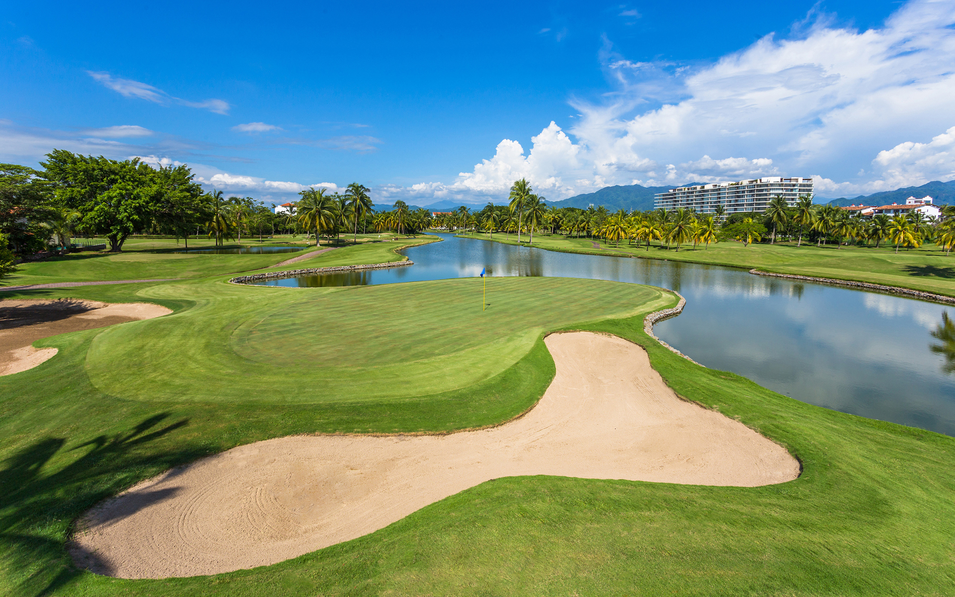 Marina Vallarta is an 18-hole course designed by the famous American architect, Joe Finger, and located in the marina area of the district of Puerto Vallarta. It is a marvelous mix of the typical tropical ambience of the Pacific coast with views of the Sierra Madre and Banderas Bay.