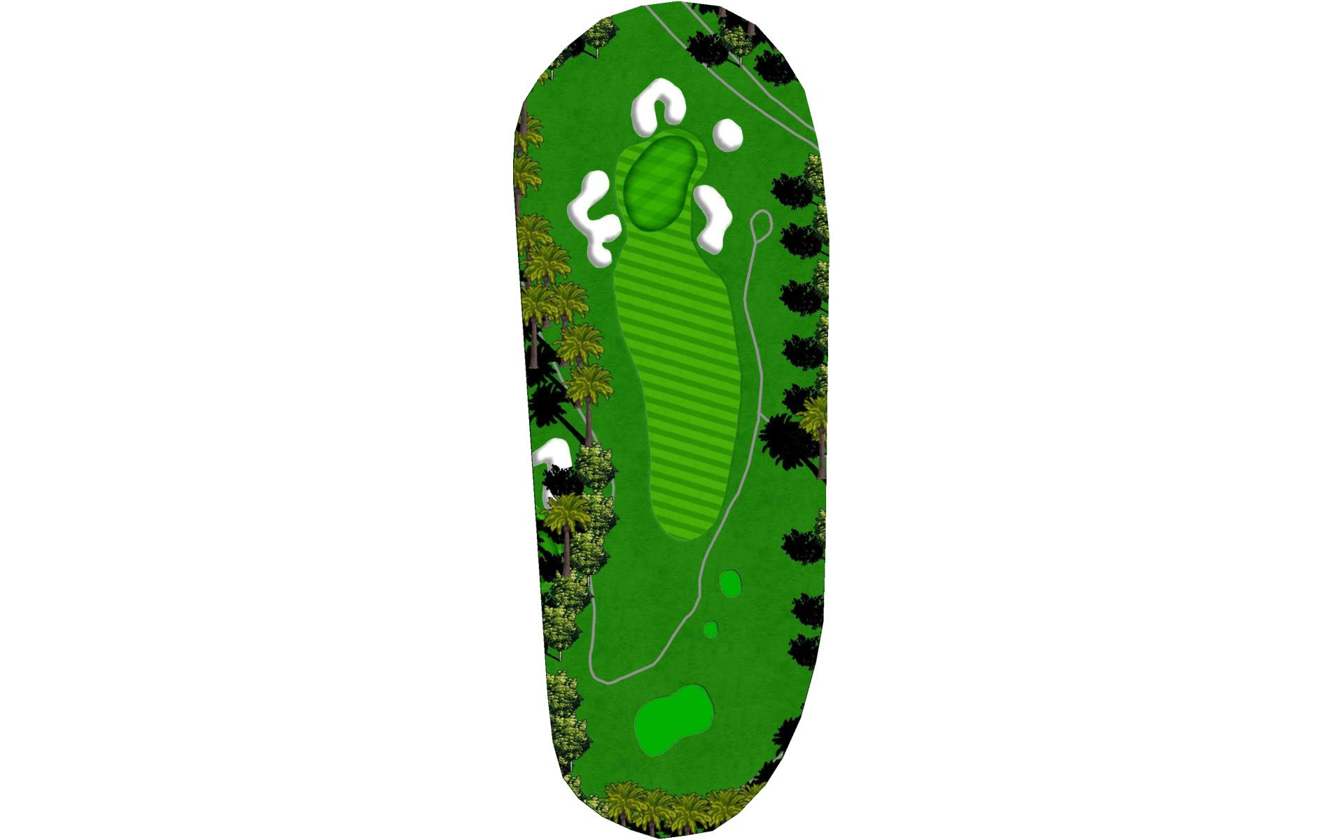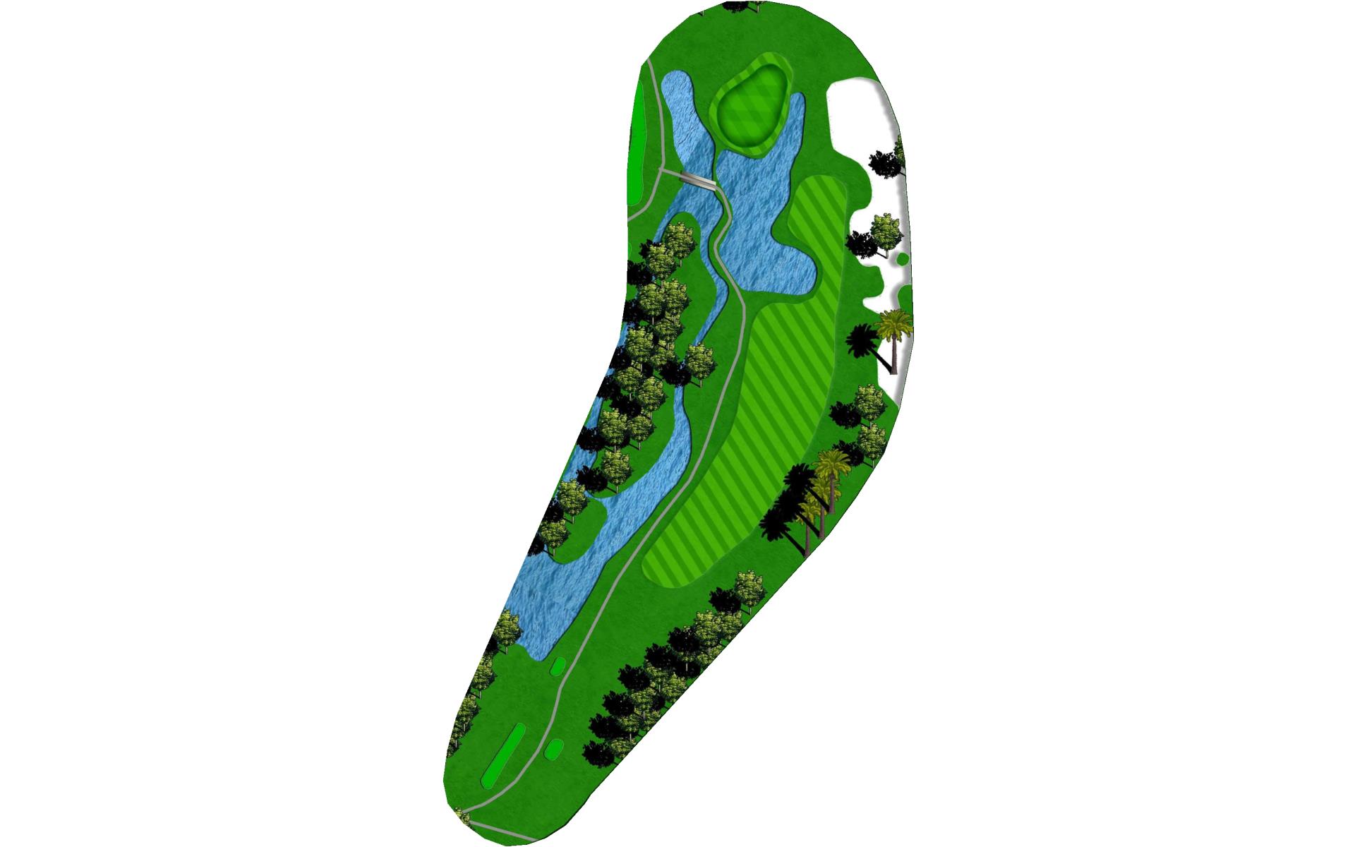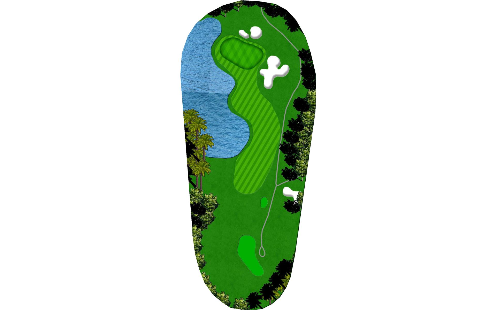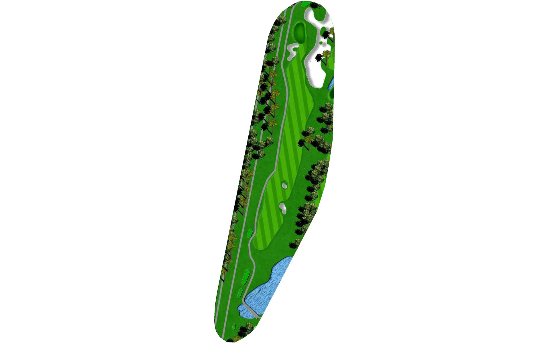 A long iron or 3 wood won't hurt here (bowling alleys are wider than this palm tree-lined fairway!). Stay short of the water and your third shot will find the green without a problem.