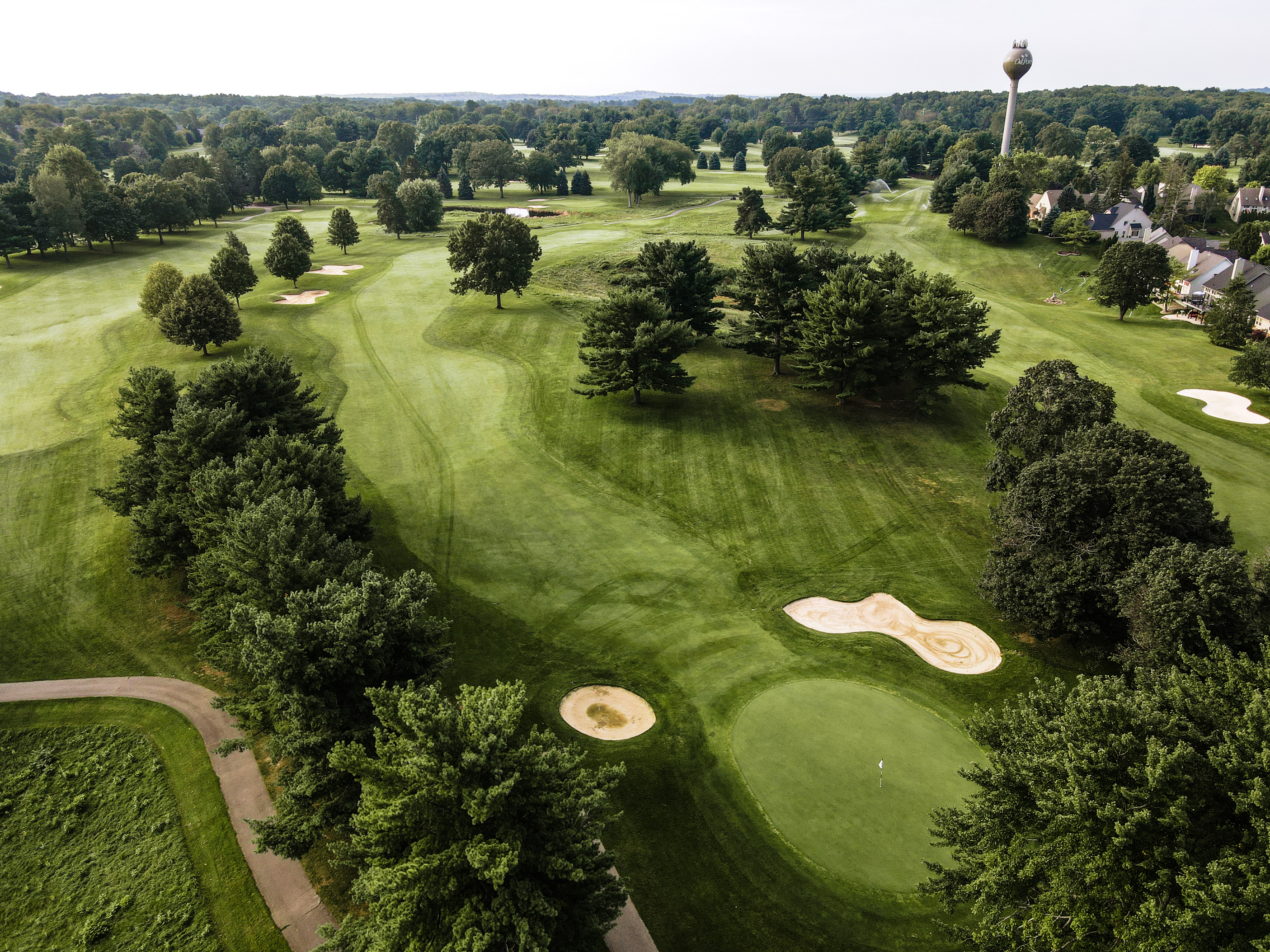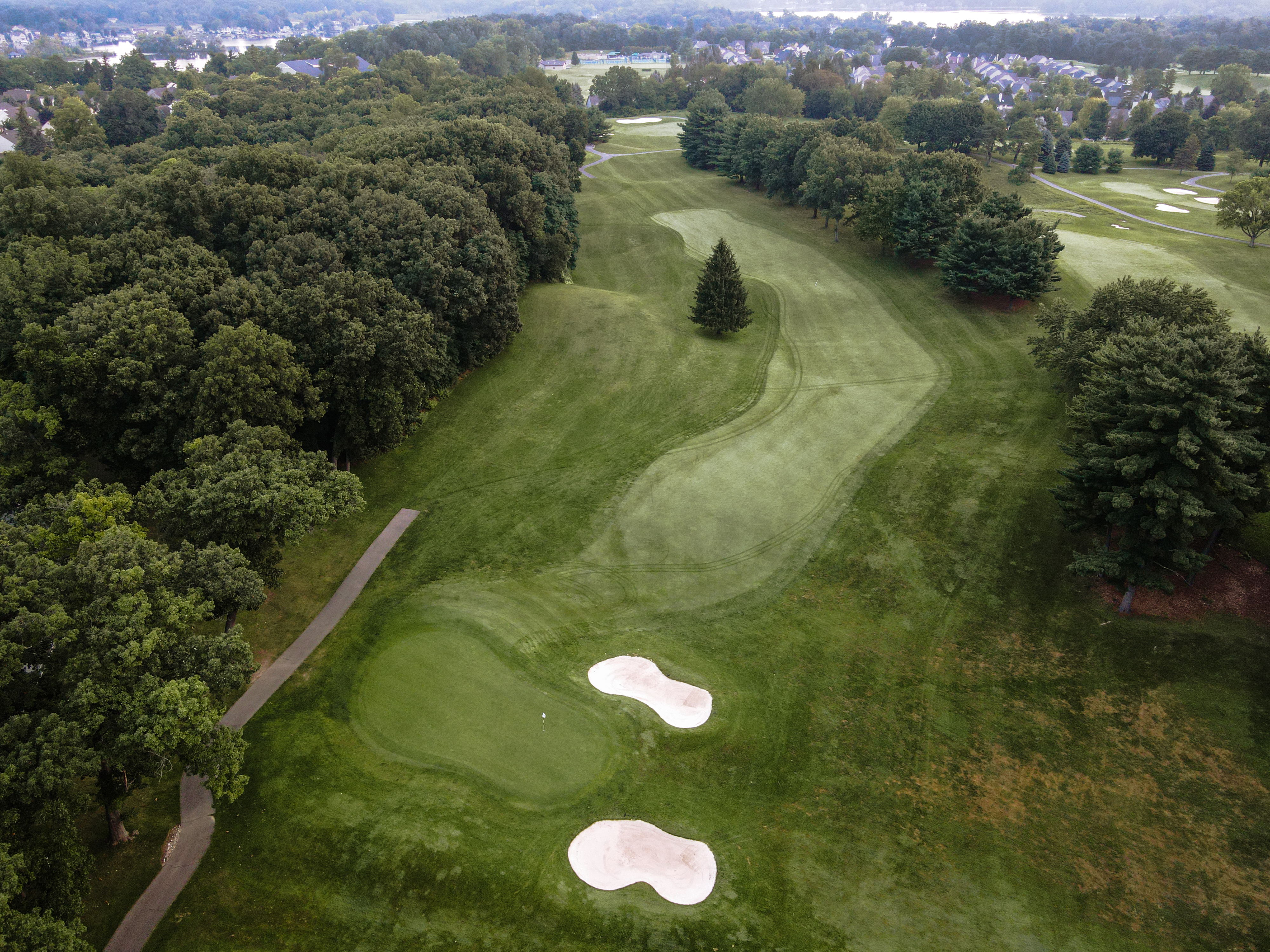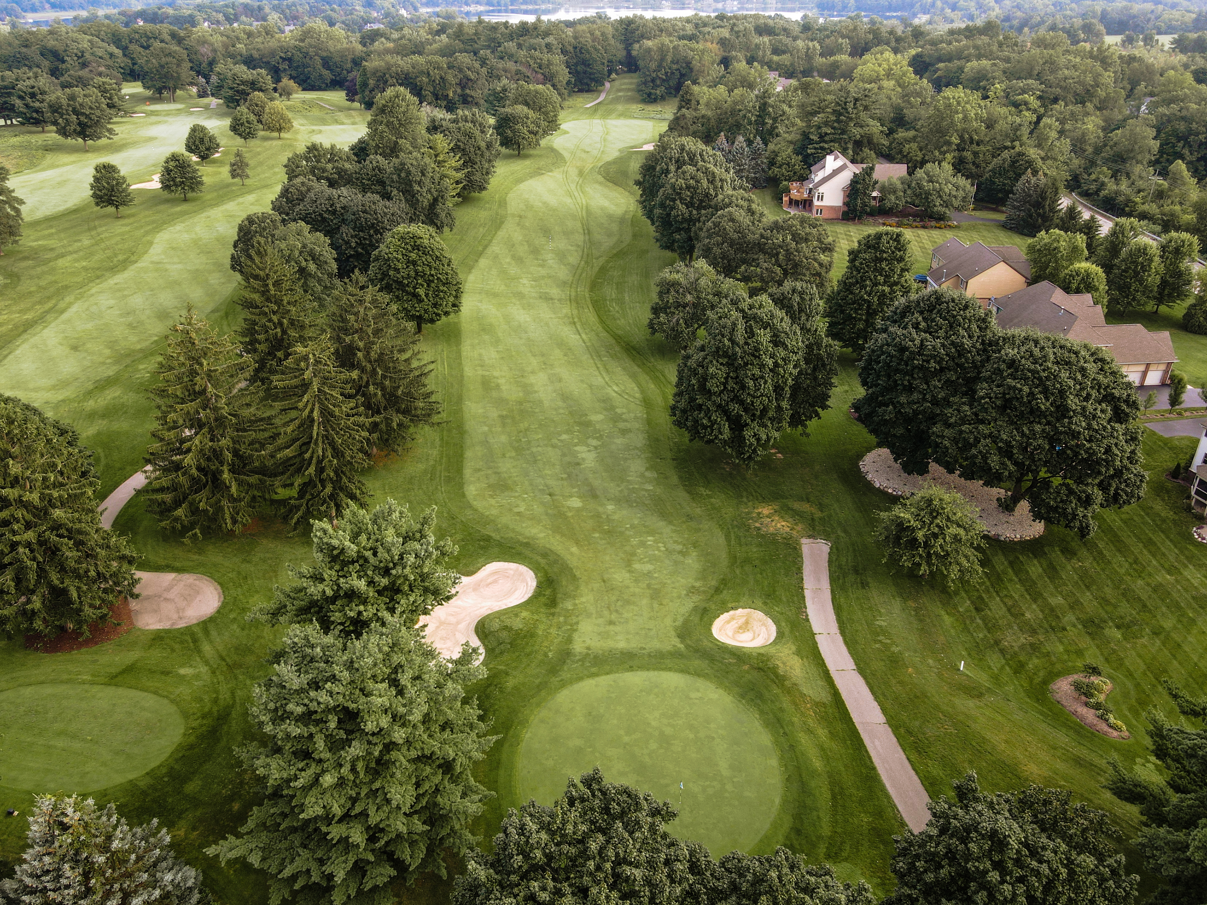Is the longest Par 4 on the front nine. An accurate tee shot will avoid the trees on both sides of the fairway. A drive aimed a few yards right of the left side fairway trap sets you up for a good approach shot. The green is protected by sand traps on the left side and mounding on the right side. Once on the green the player will need to manage putts that can have significant break.