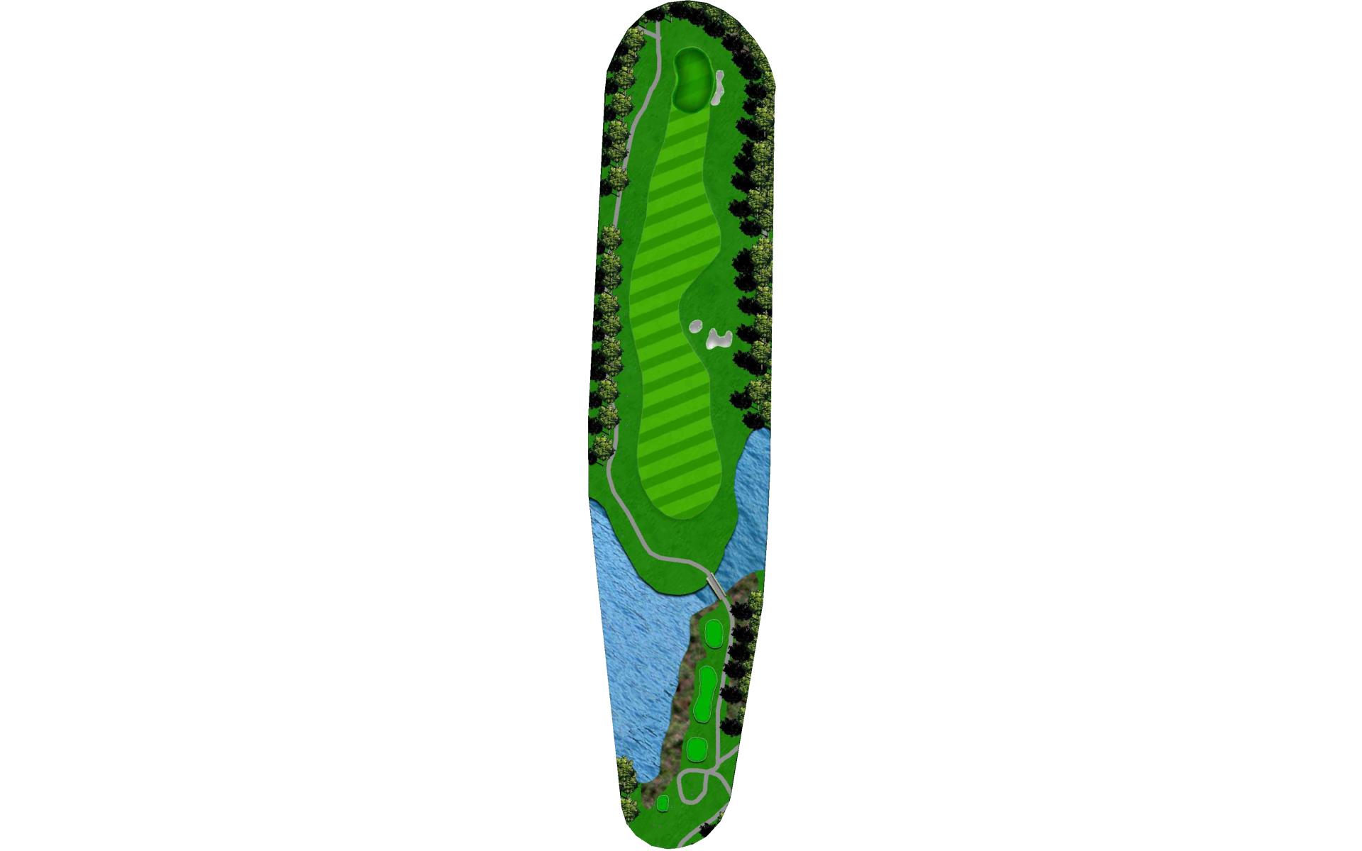 Tight Par 4 with creek along the right side of hole. Large green with middle slope.