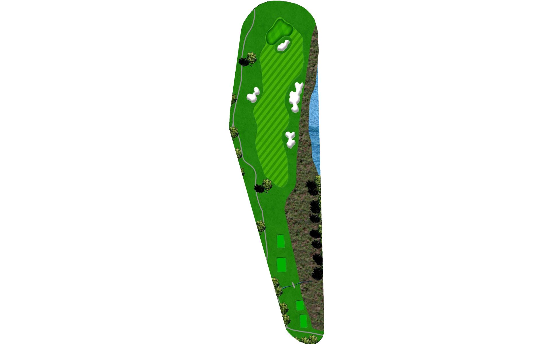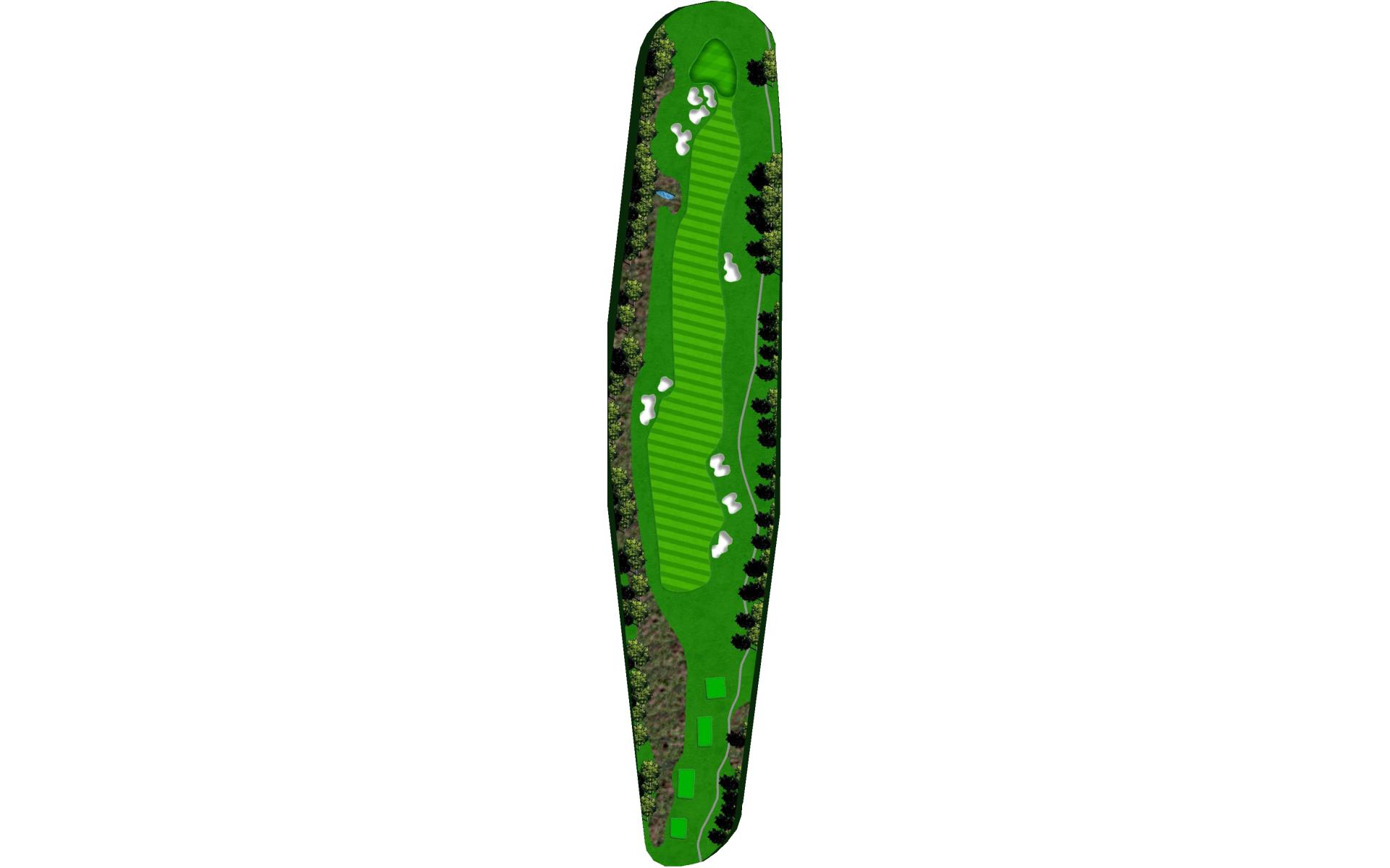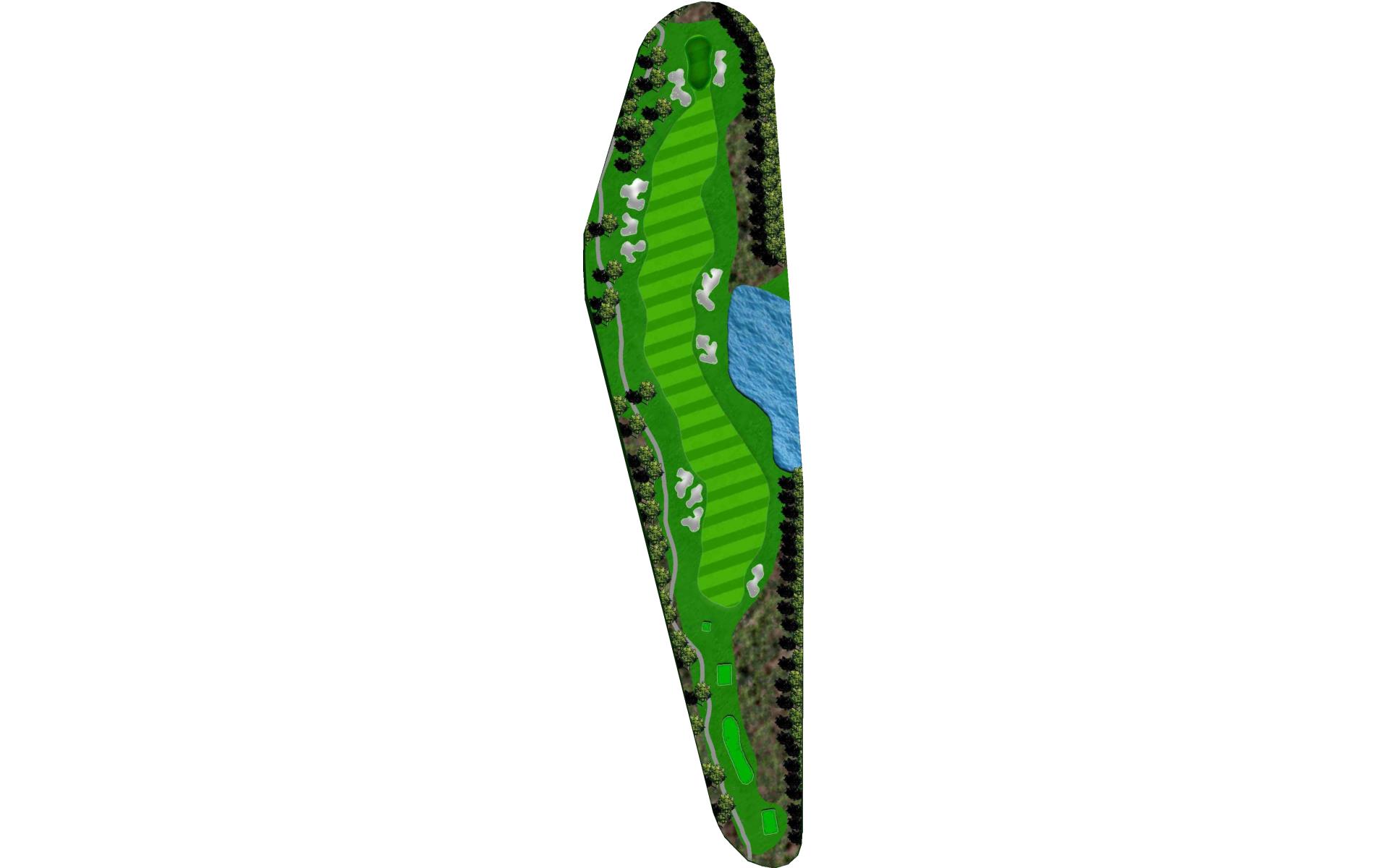 A tight risk/reward par 4. The brave of heart can try and drive the green or lay up with a long iron or hybrid, which will leave a full wedge into this green. Out of bounds lines the entire right side of the hole and a pond is present on the left and comes into play off the tee. The smart play is to leave yourself a full wedge into the green.