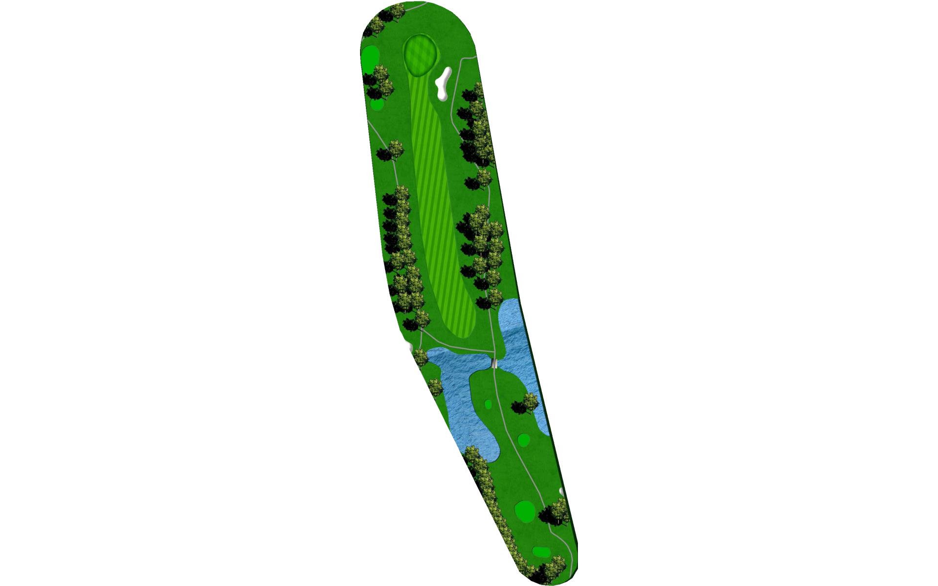 Difficult tee shot with water on right and crossing the fairway. Mostly a three-shot hole. Difficult approach shot to a narrow green that is slightly elevated.
