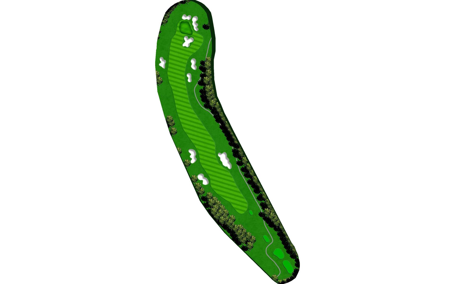 A long, slow dogleg to the right. Keep it to the left side of the fairway for the best approach.