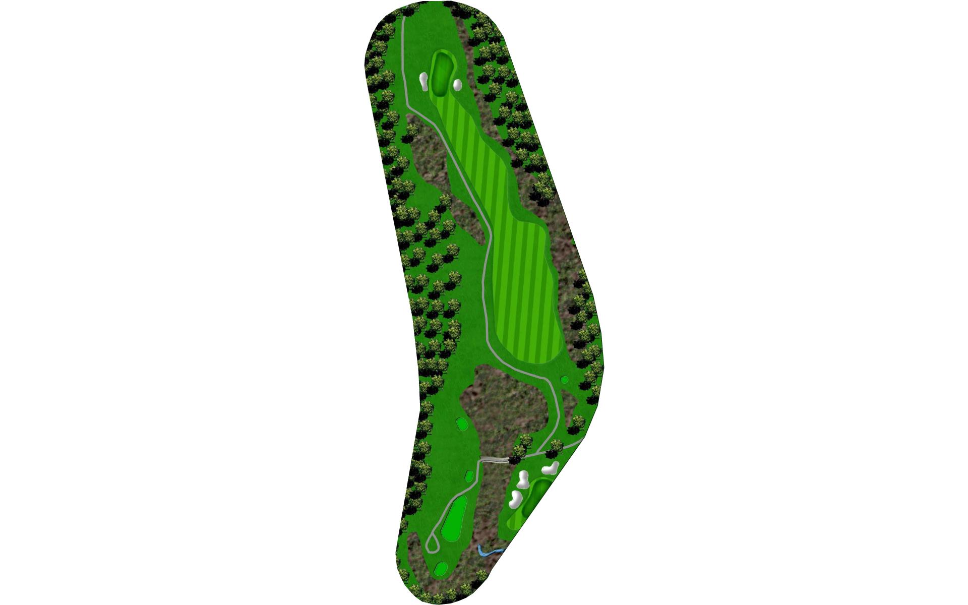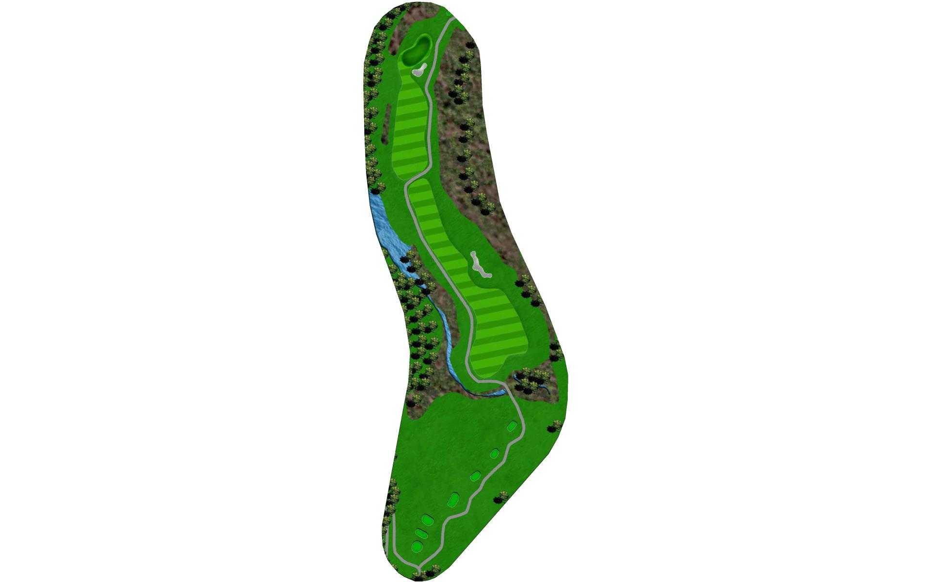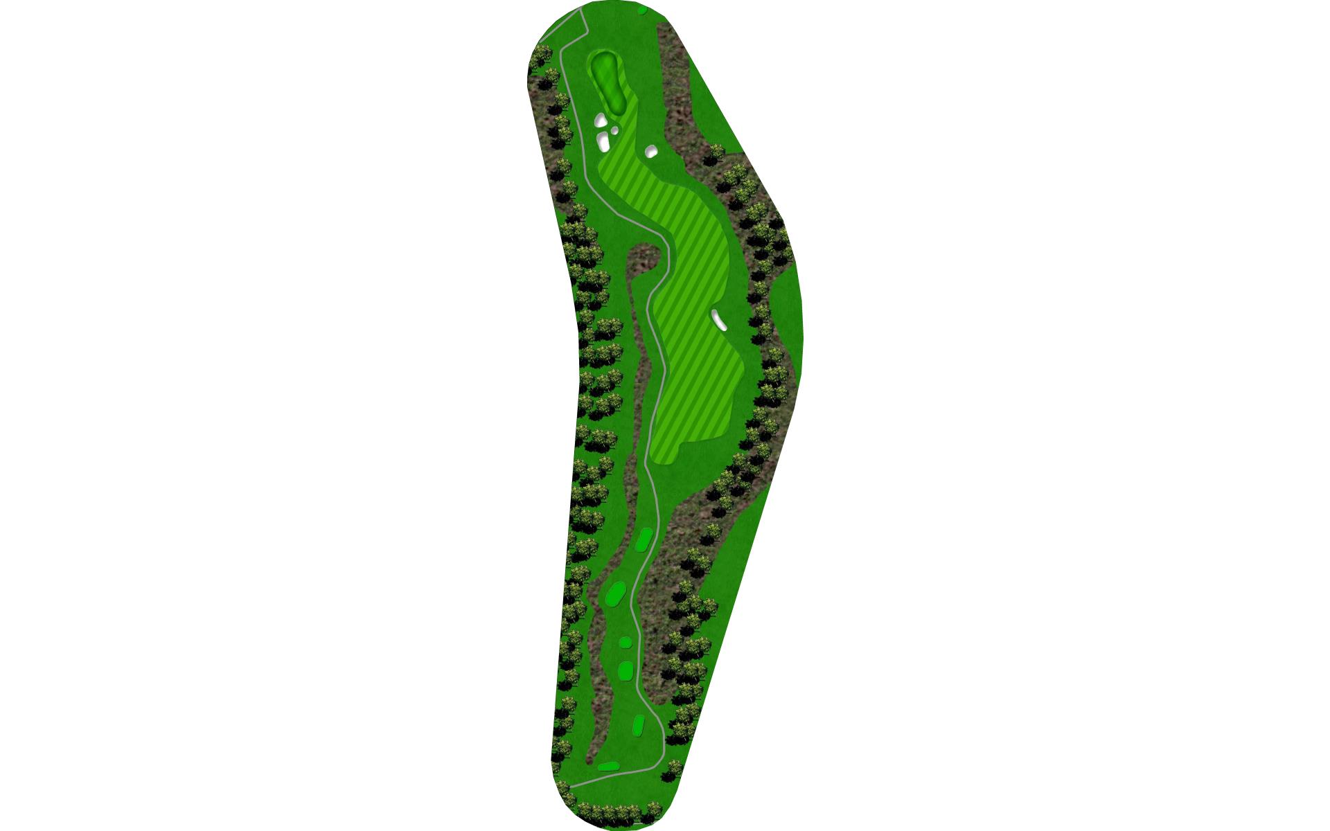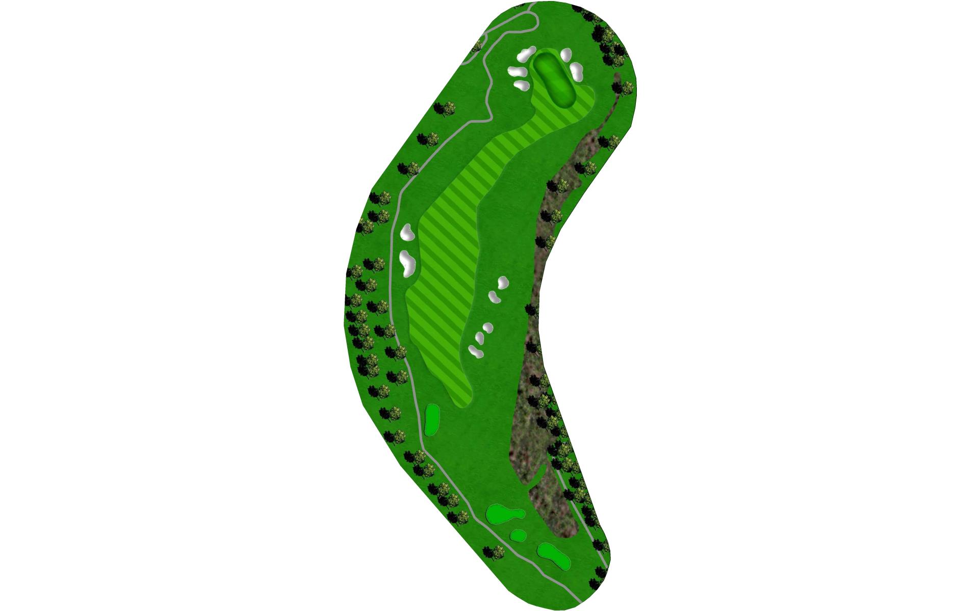 This is a great three shot double dogleg Par 5. The tee shot plays downhill and over a stream. The wide first landing area is still guarded by trees along both sides of the fairway and narrows as the hole turns left. The hole then turns to the right with a hillside along the right and penalty area left requiring a precise second shot for the final approach. The green is set at an angle with bunker short right and has a predominant slope from back right to front left of the green.