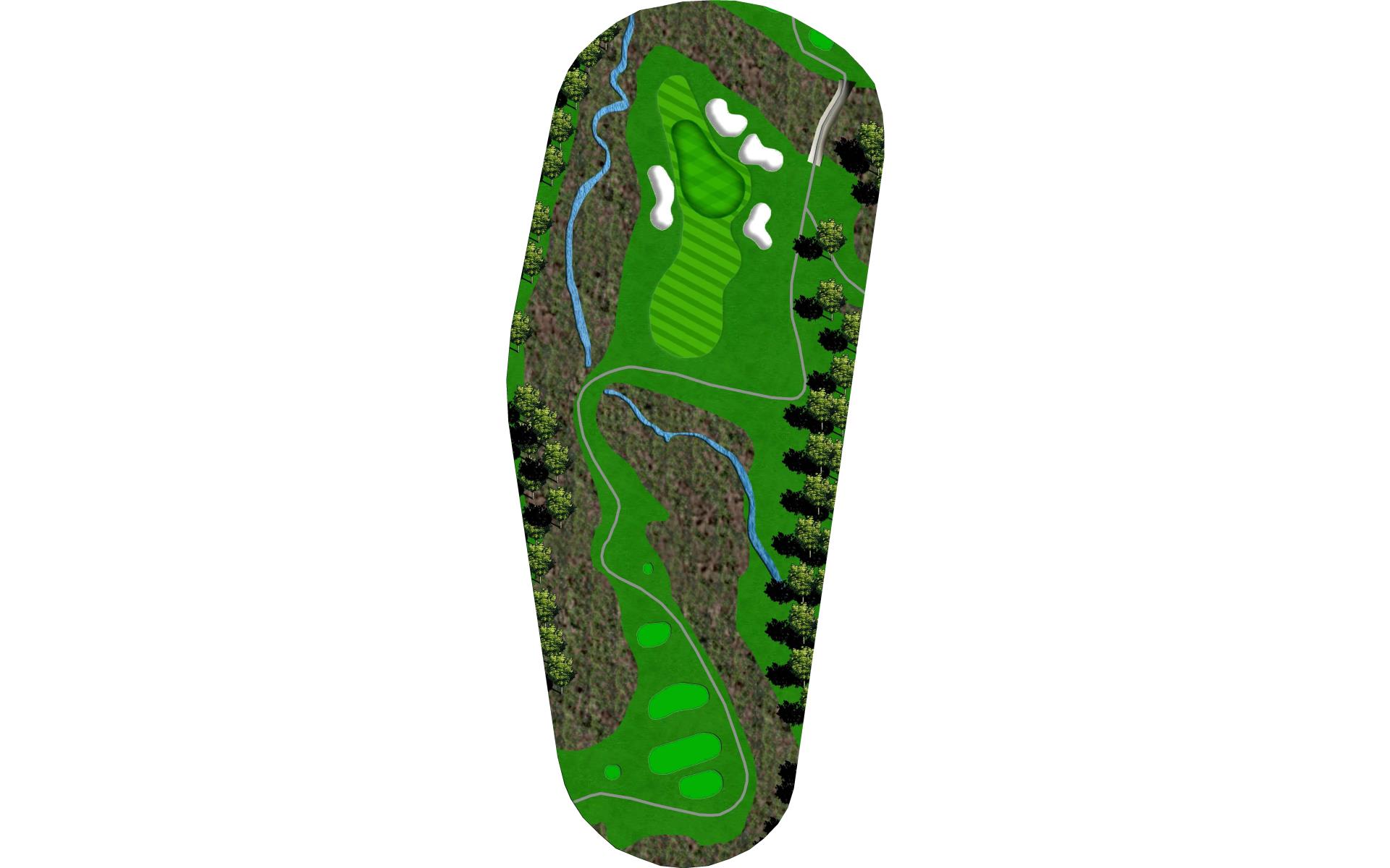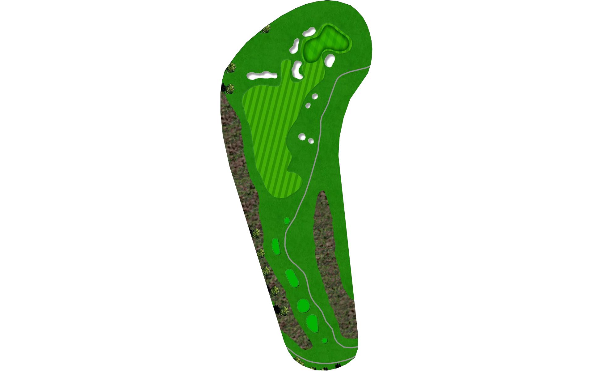 After crossing the wetland behind the previous green, these tees are elevated 25 feet above the wetland. This is done so that the tee shot does not play uphill as much. Standing on the tee, players are looking across a wetland that borders most of the left side of the hole. The preferred side of the plateau fairway is the left in order to shorten the approach shot. This severely sloped green sits elevated with a bunker left and shots falling short may find a deep bunker right or a sloping approach fairway. This entire hole is framed by dense forest along both sides.