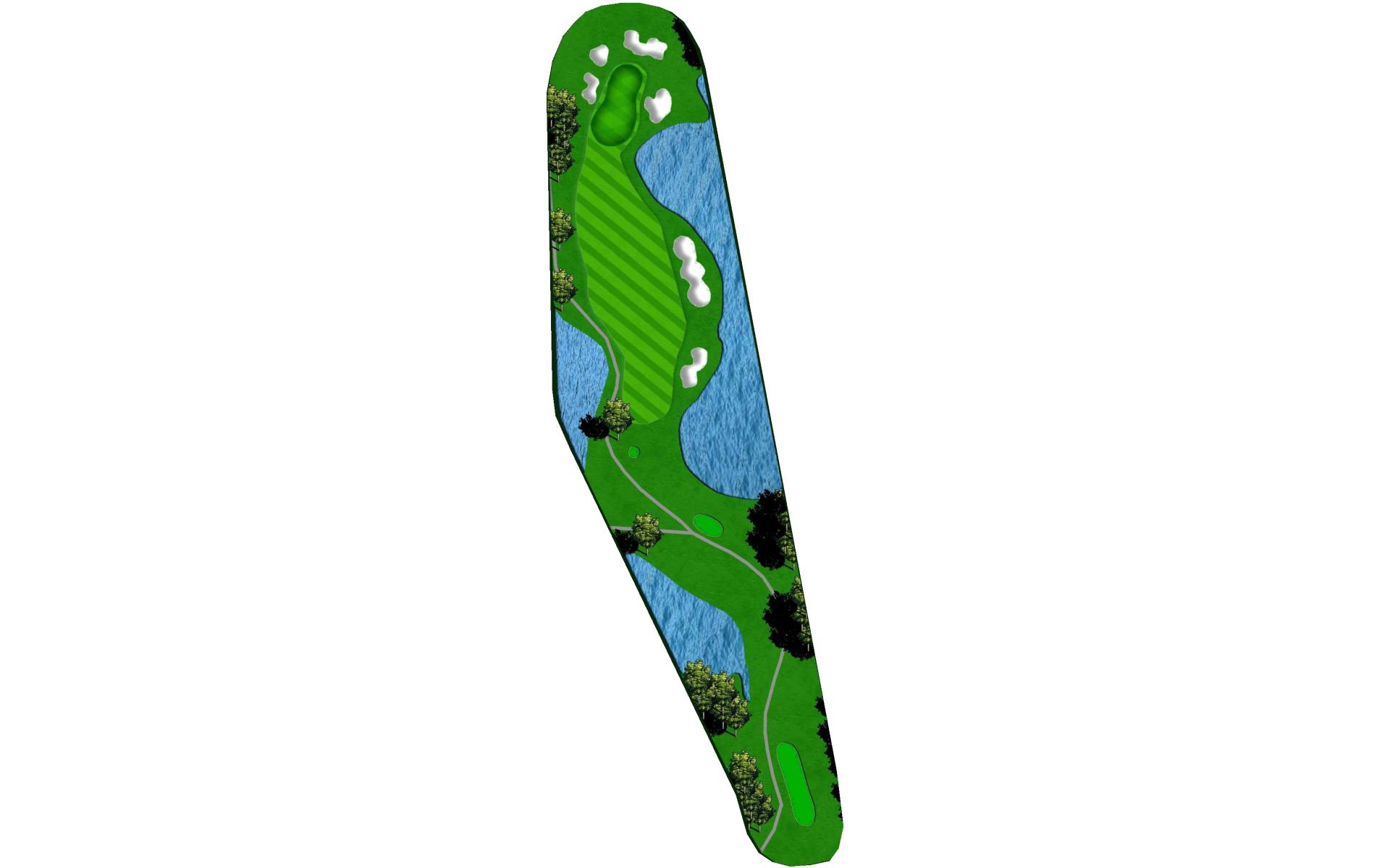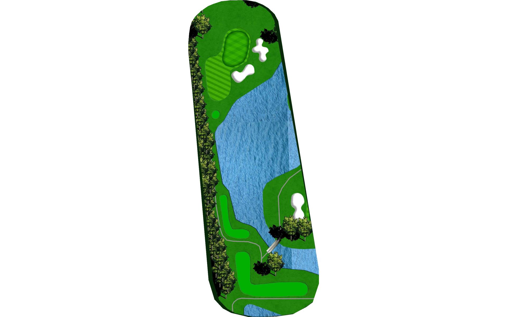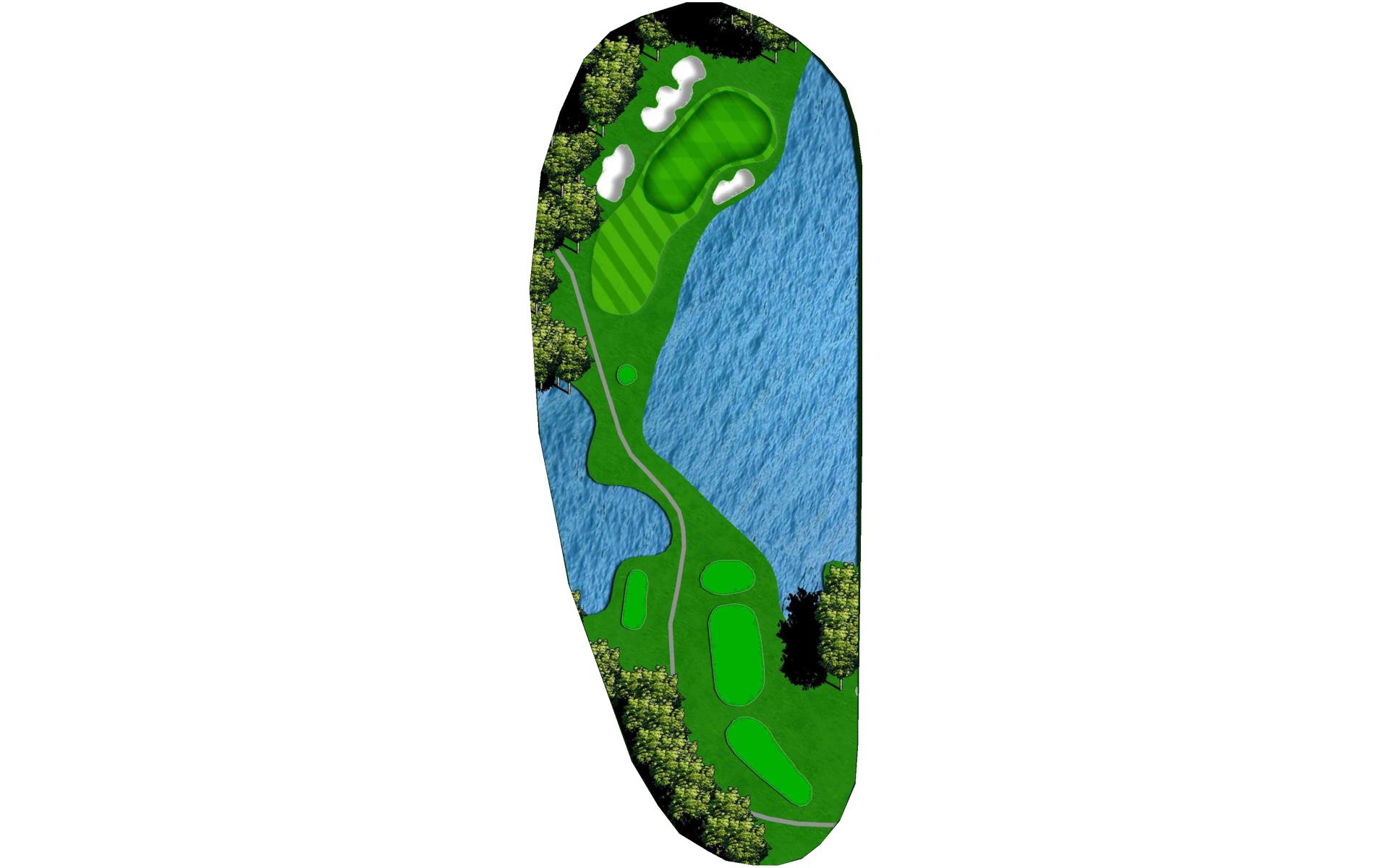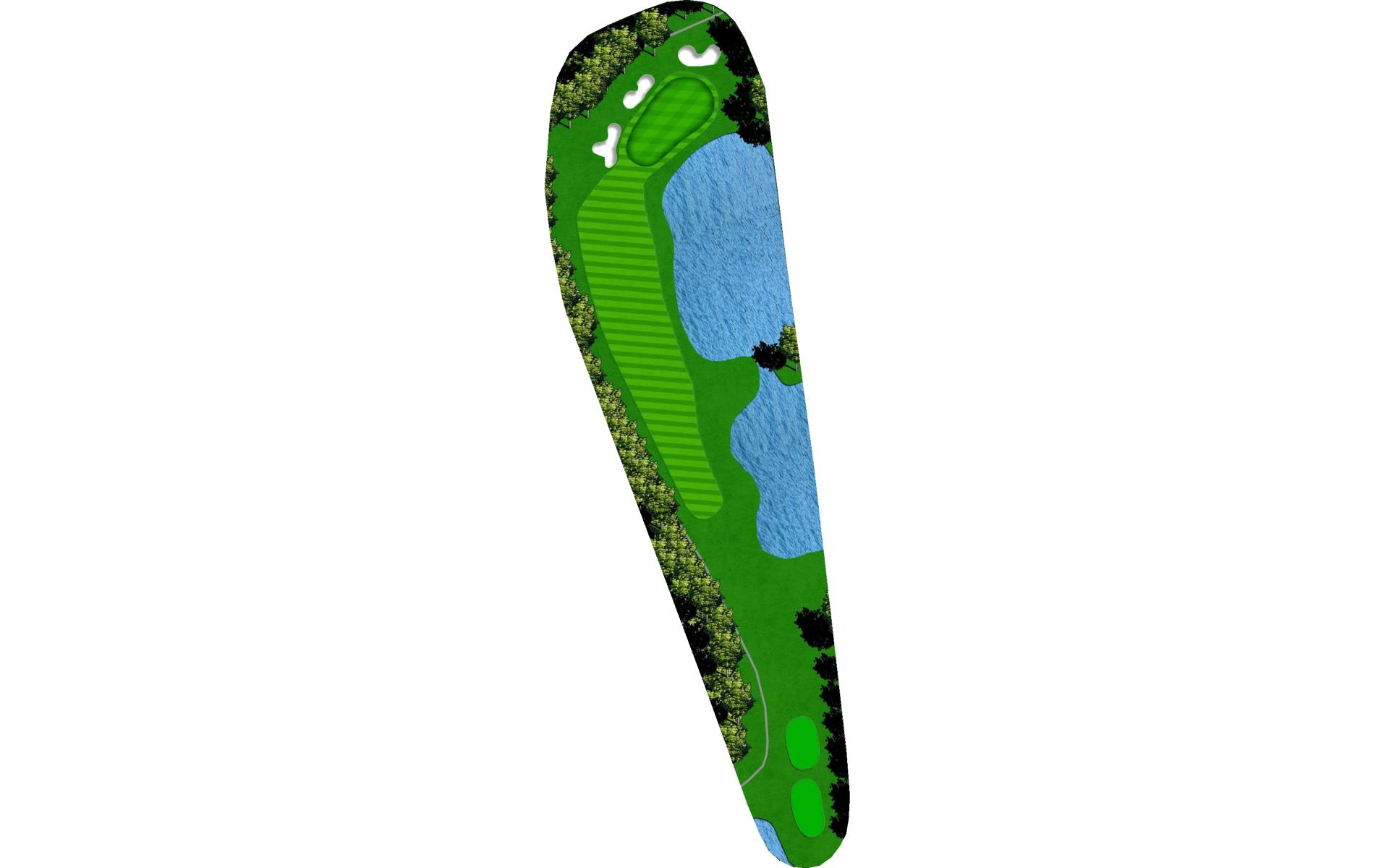 | A very challenging green that is well protected with both water and bunkers. Left is a safe miss. |